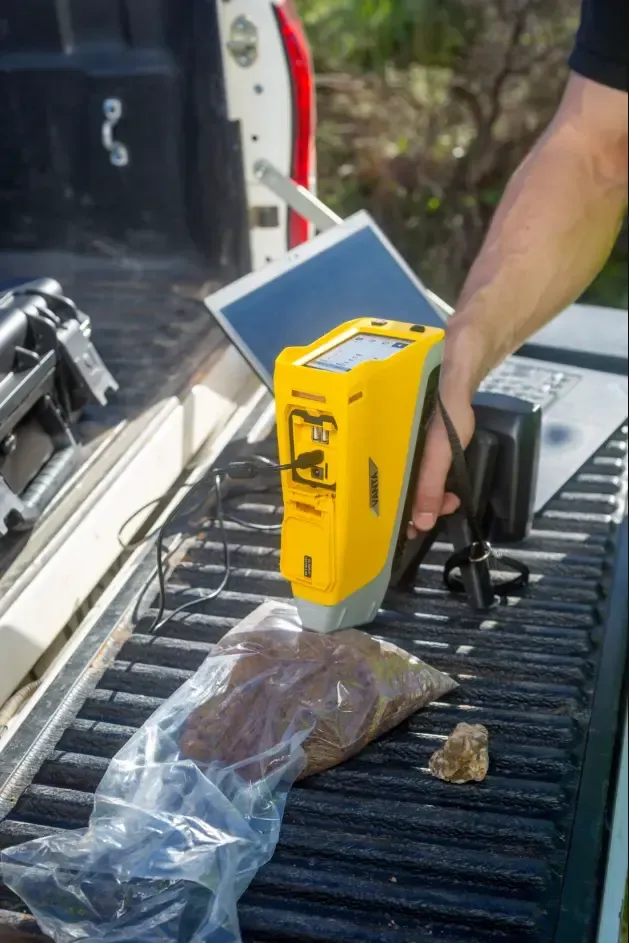 Vanta Max XRF analyzer analyzes a soil sample in the field.